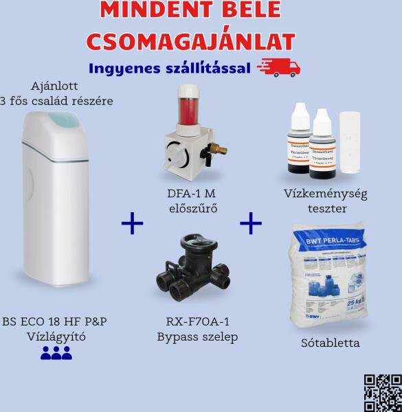 Euro-Clear BlueSoft Eco 18 HF Plug&Play vízlágyító berendezés + DFA-1M előszűrő + bypass + Vízkeménység teszter + sótabletta (BSEco-18HF/P&P-HU-1-2)